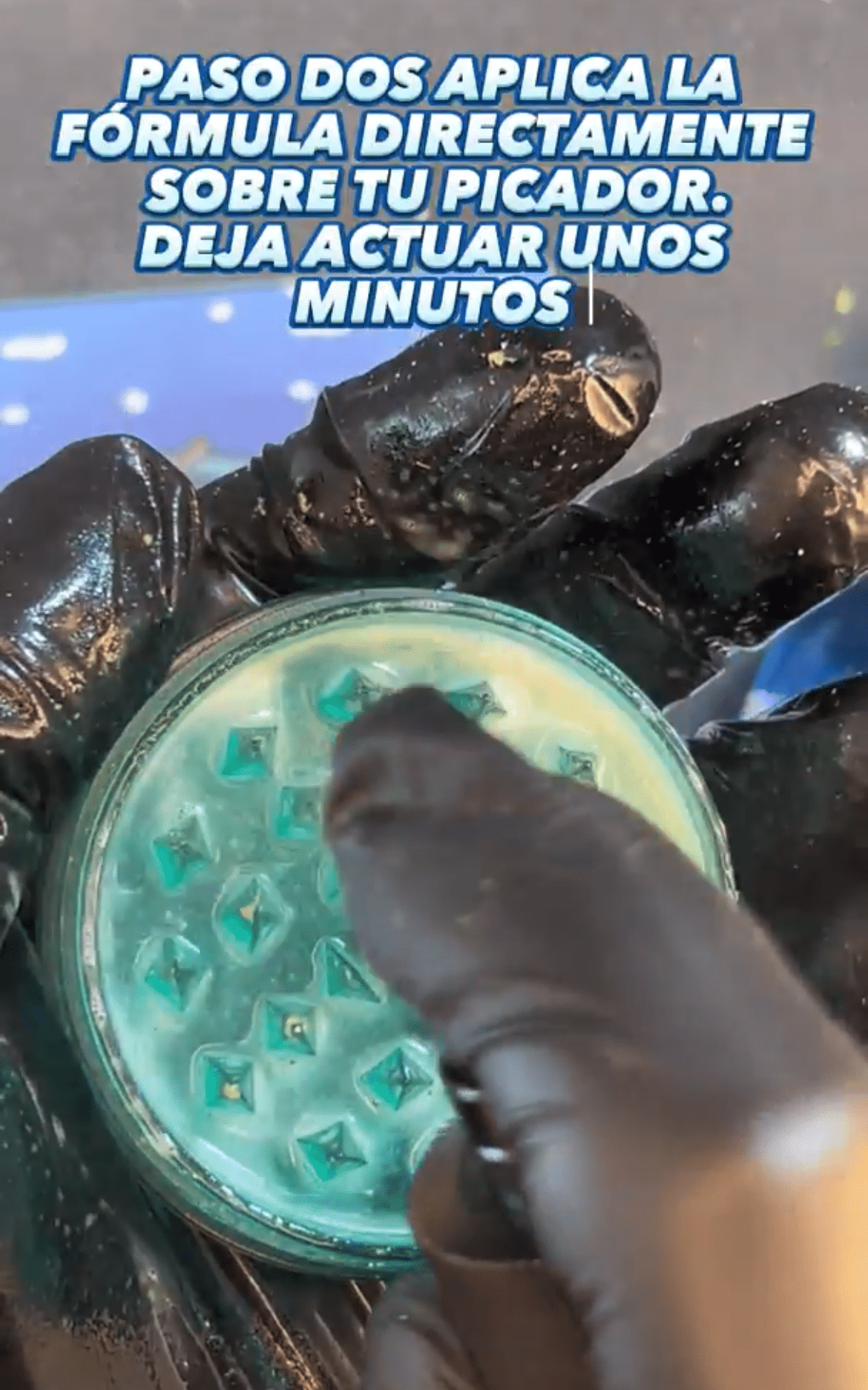 2. Aplicación Controlada: Rocía la fórmula directamente sobre todas las superficies del grinder.